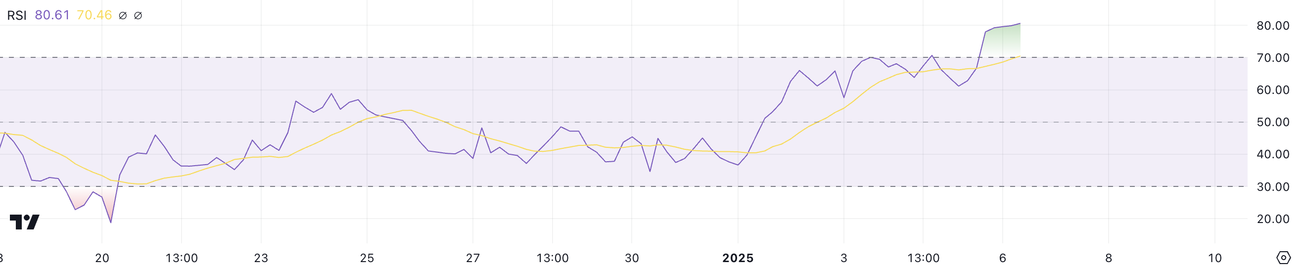 70’in üzerindeki okumalar genellikle aşırı alım koşullarını işaret eder. Bir geri çekilme veya fiyat durgunluğunun yakın olabileceğini gösterir, 30’un altındaki okumalar ise aşırı satım koşullarını işaret eder ve genellikle potansiyel bir fiyat toparlanmasına işaret eder.