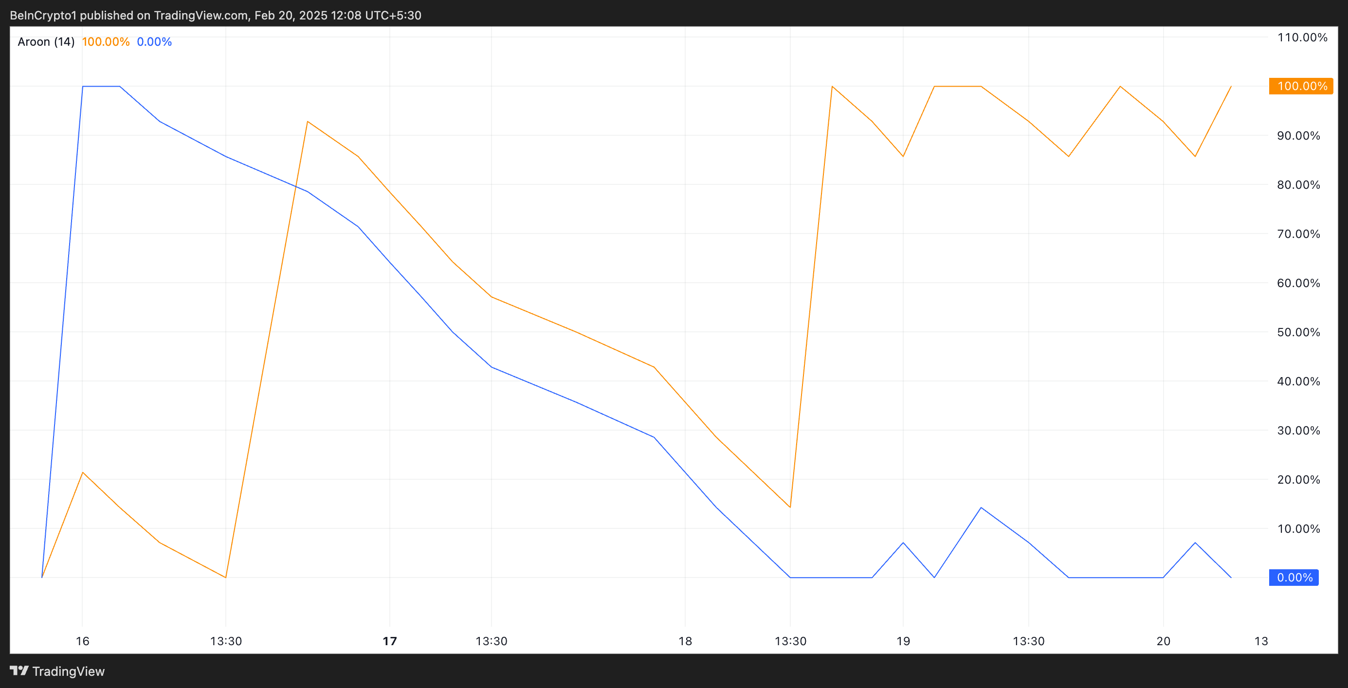 IP’de olduğu gibi, Aroon Up çizgisi %100 olduğunda, varlık yakın zamanda yeni bir zirveye ulaştı demektir ve bu, güçlü bir yukarı yönlü momentum ve baskın bir yükseliş trendi sinyali verir. Bu, alım baskısının yüksek olduğunu ve fiyatın yükselmeye devam edebileceğini gösterir.