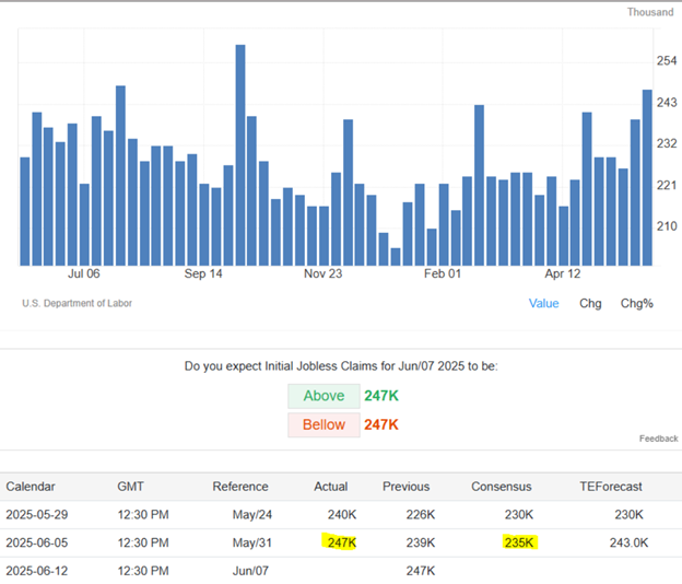 Perşembe günü açıklanan veriler, ABD’de ilk işsizlik başvurularının 31 Mayıs’ta sona eren hafta için 8.000 artarak 247.000’e yükseldiğini gösteriyor.
