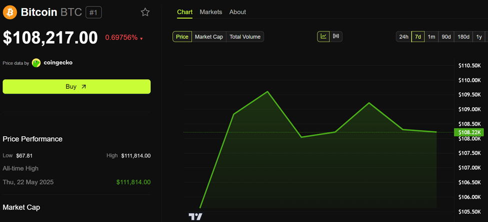 Ancak makro sarsıntılara rağmen, Bitcoin olağanüstü bir şekilde istikrarlı kalıyor. Bu yazı itibarıyla, BTC 108.217 Dolar seviyesinde, sıkı bir aralıkta işlem görüyor.