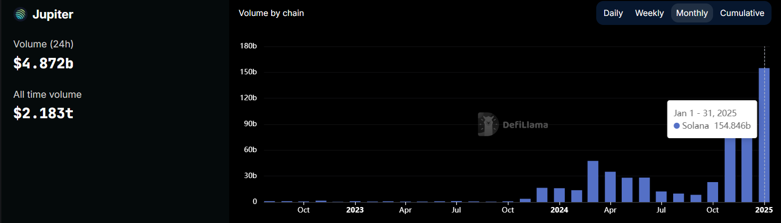 Jupiter, Solana DEX ekosisteminde liderlerden biri olmaya devam ediyor. Platform, son gün içinde 4,87 milyar Dolar’lık trading hacmi işledi ve DeFiLlama verilerine göre tüm zamanların trading hacmi 2,18 trilyon Dolar. Ocak 2025 özellikle dikkat çekici oldu ve platform 155 milyar Dolar’lık işlemi kolaylaştırdı.