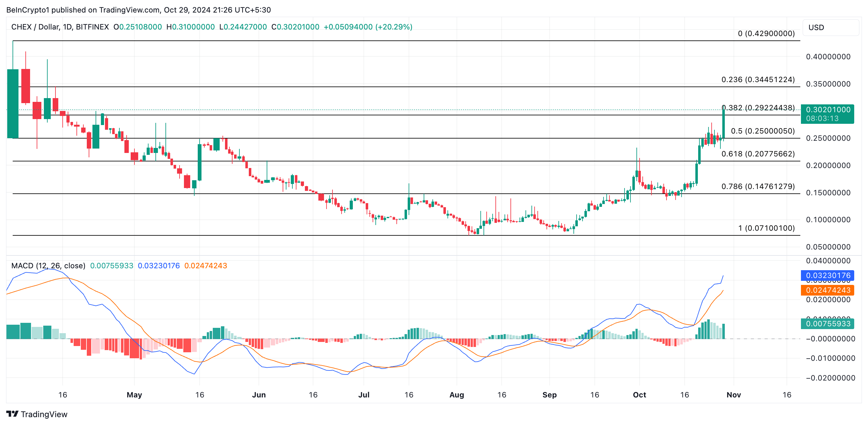 CHEX, Chintai Ağı’nın yardımcı token’ı, şu anda geçen ay %22 artışla 0,30 dolardan işlem görüyor. Hareketli ortalama yakınsama/ıraksama (MACD) okumaları, CHEX’in MACD çizgisinin (mavi) sinyal çizgisinin (turuncu) üzerinde konumlandığı uzatılmış bir fiyat rallisi potansiyelini öneriyor.
