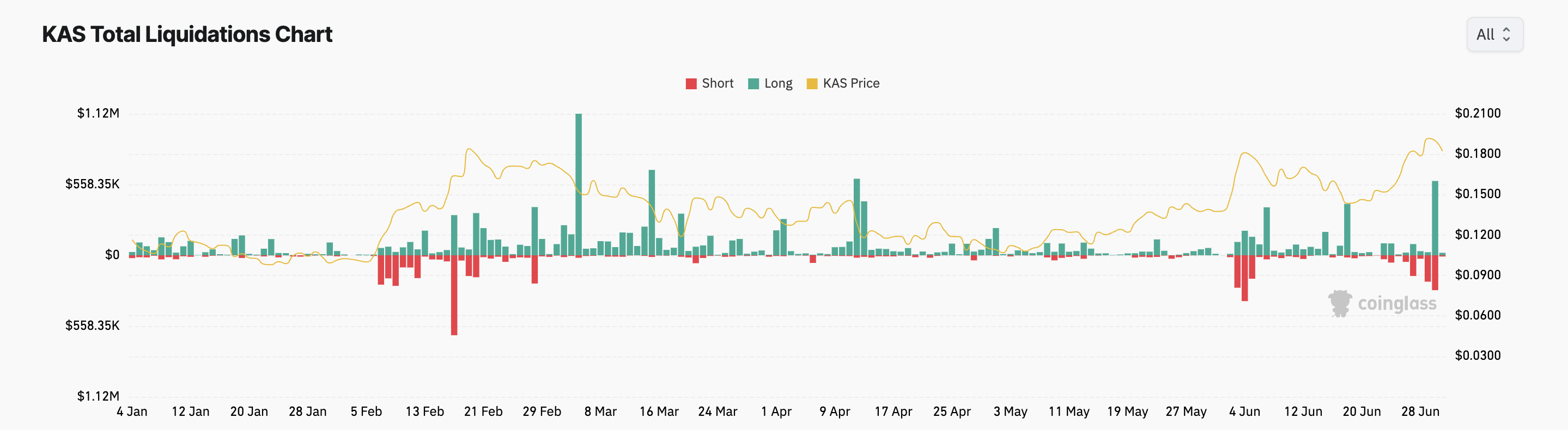 KAS sonunda tüm zamanların en yüksek seviyesinden düzeltme yaptığında, birçok uzun pozisyon tasfiye edildi. 30 Haziran’da, tasfiye edilen uzun pozisyonların değeri 586.220 dolara ulaştı, bu Mart 16’dan bu yana tek günlük en yüksek değerdi.