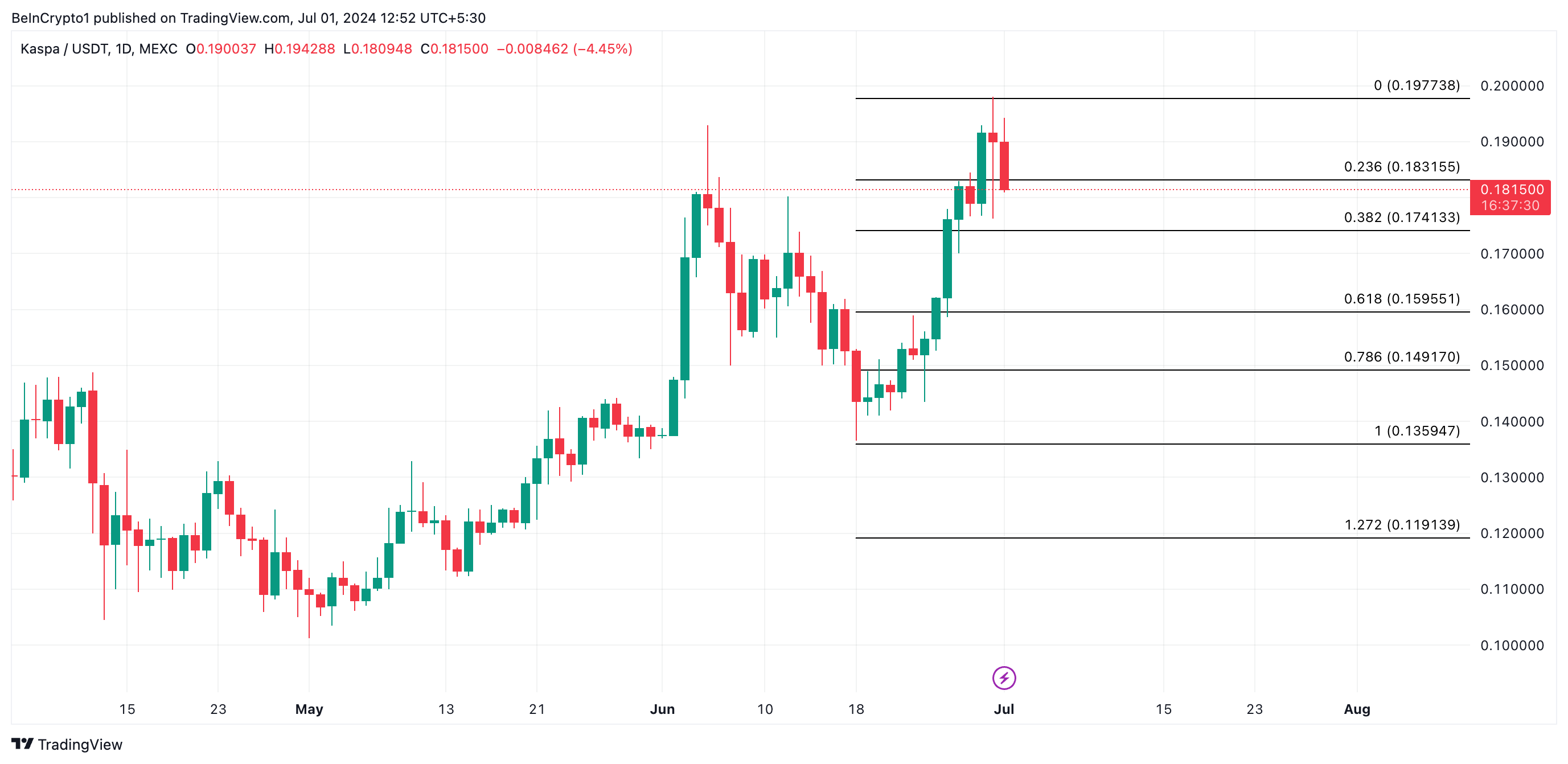Kaspa proof-of-work blockchain’ini güçlendiren altcoin KAS, 30 Haziran’da 0,19 dolarla tüm zamanların en yüksek seviyesine ulaştı. Yazı yazılırken 0,18 dolardan işlem gören token değeri %7 oranında düşüş yaşadı.