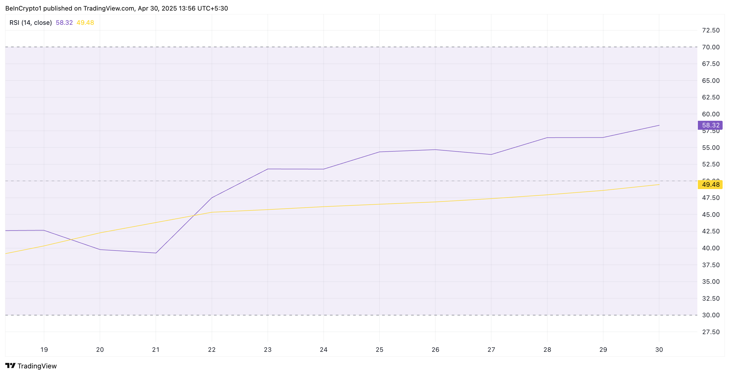 RSI göstergesi, bir varlığın aşırı alım ve aşırı satım piyasa koşullarını ölçer. 0 ile 100 arasında değişir ve 70’in üzerindeki değerler varlığın aşırı alındığını ve fiyat düşüşünün muhtemel olduğunu gösterir. Tersine, 30’un altındaki değerler varlığın aşırı satıldığını ve bir toparlanma yaşayabileceğini gösterir.