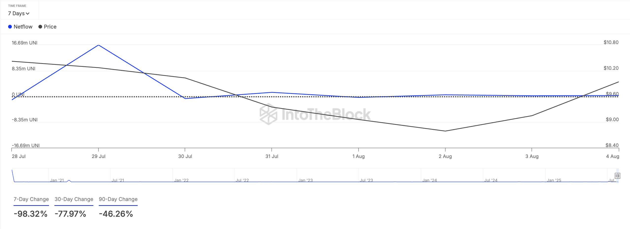 Merkeziyetsiz finans (DeFi) token’ı UNI, balinaların 7 Ağustos öncesinde dağıttığı varlıklardan biri gibi görünüyor. IntoTheBlock verilerine göre, büyük sahiplerin net akışı son yedi günde %98 oranında düştü.