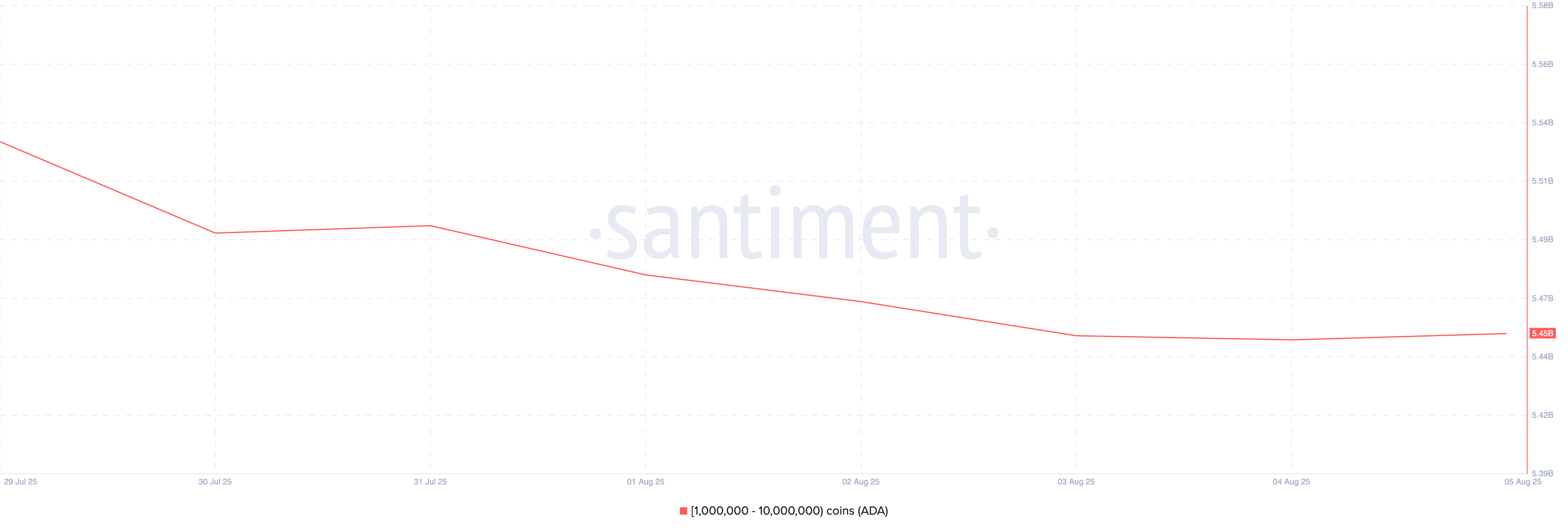 Santiment’ten alınan zincir üstü verilere göre, 1 milyon ile 10 milyon coin arasında ADA tutan balina adresleri son yedi günde 80 milyon ADA sattı.