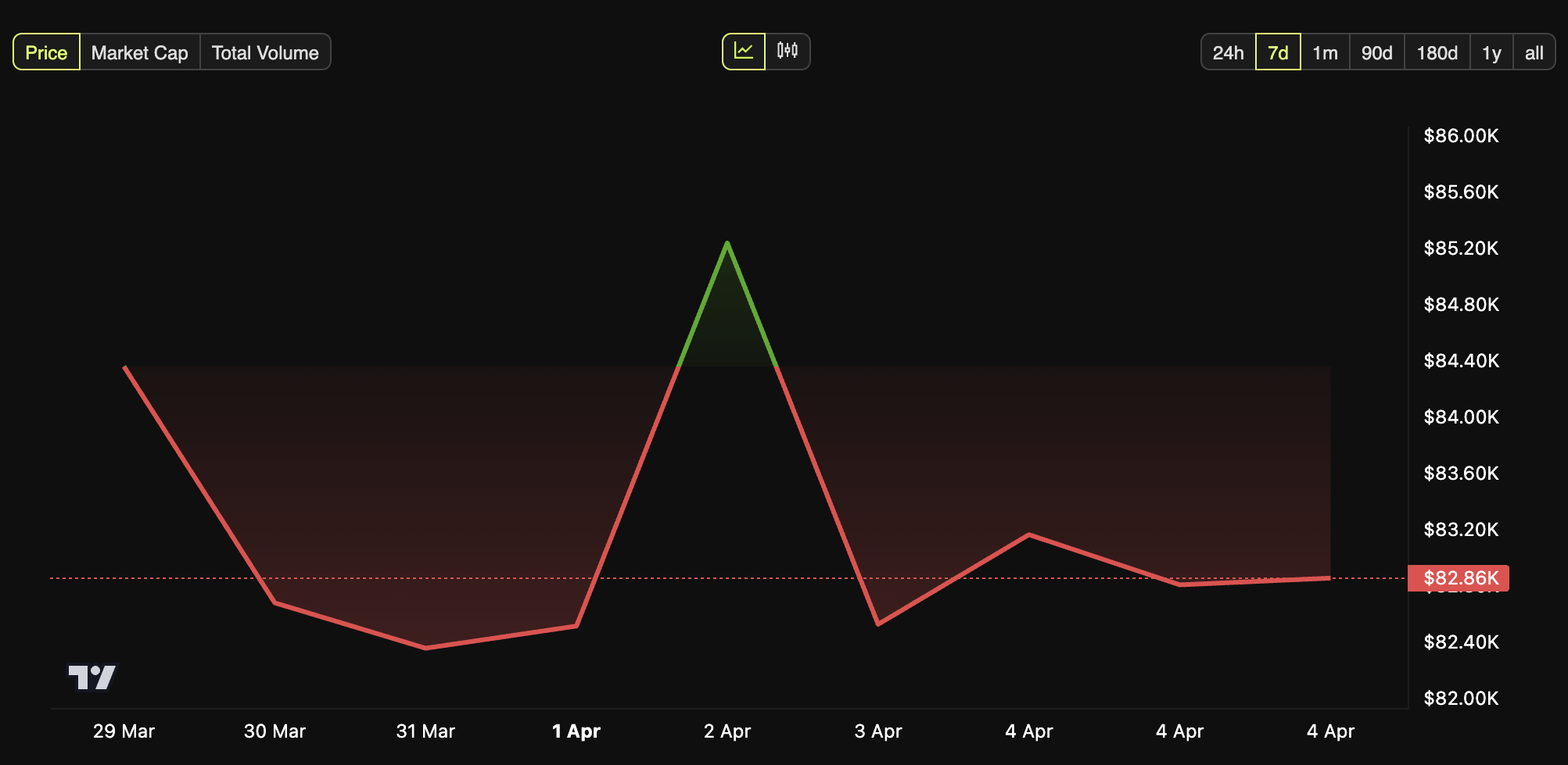 Şu an için, Bitcoin mütevazı kayıplar yaşamaya devam ediyor. Geçtiğimiz hafta %4,5 düşerken, son gün %1 değer kaybetti. Yazı yazılırken, Bitcoin 82.855 Dolar’dan işlem görüyordu.