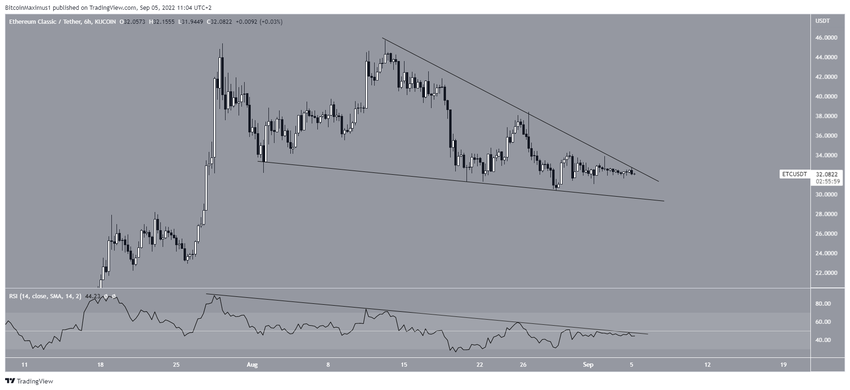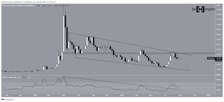 ETC, Mayıs 2021’de 179 dolara ulaştıktan sonra düşüşe geçti. Popüler altcoin, bu noktadan beri, yükseliş formasyonu olarak kabul edilen alçalan takoz içinde işlem görüyor.