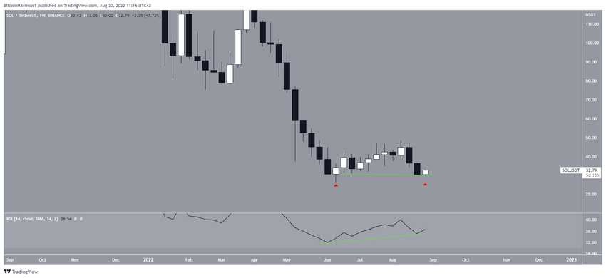 Haftalık grafiğe göre SOL, Haziran ayında yukarı yönlü bir hareket başlatmasına rağmen, şu anda yılın en düşük seviyesi olan 25,86 dolara çok yakın işlem görüyor. Bu hareket sonucunda potansiyel bir çift dip formasyonu oluşmuş olabilir. Ayrıca haftalık RSI’da da pozitif uyumsuzluk ortaya çıktı.