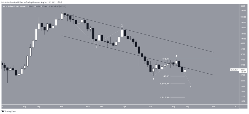 Solana şu anda bu hareketin dördüncü dalgasında yer alıyor ve dördüncü dalga geri çekilmesini tamamlıyor olabilir. Bu senaryoda dip için ana iki hedef 1.27 ve 1.61 harici Fib düzeltme seviyeleri olan 19,77 dolar ve 12,10 dolar olarak duruyor..