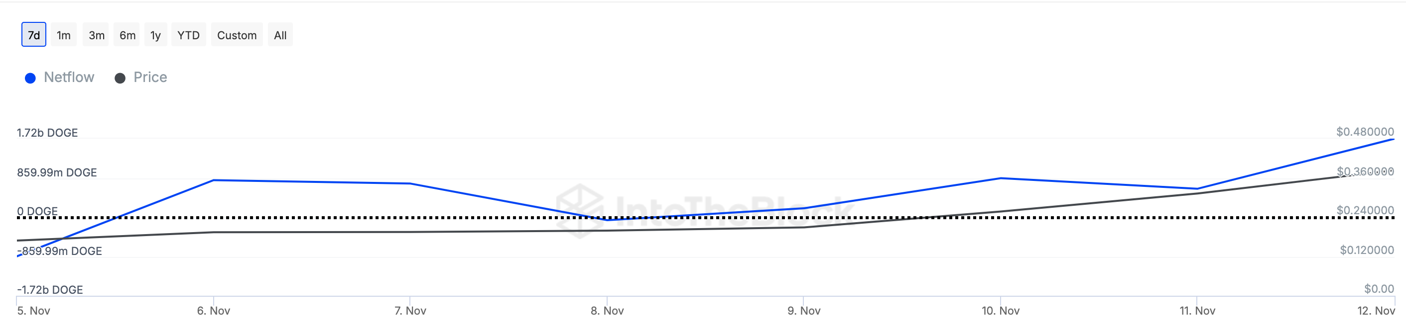 Önceki aylarda olduğu gibi, Dogecoin yine Aralık ayında potansiyel kazançlar için kripto para balinalarının satın aldığı coin’ler listesinde. IntoTheBlock’a göre, büyük sahiplerin net akışı birkaç gün öncesine göre arttı.