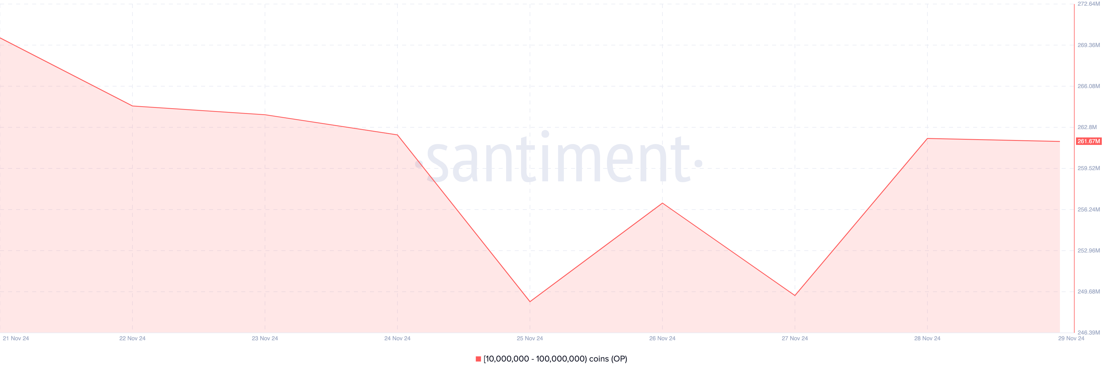Geçmişten beri, Ethereum fiyatı arttığında, OP daha büyük bir oranda yükselmektedir. Santiment’e göre, 10 milyon ile 100 milyon OP token’ı tutan cüzdanların adres bakiyesi önemli ölçüde arttı.