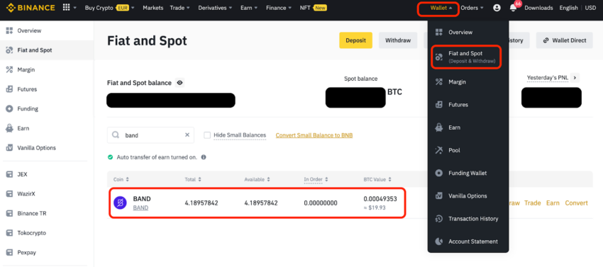 Fonlarınızı görmek için Cüzdan > İtibari Para ve Spot seçeneğine tıklamak gerekir. Burada Binance hesabınızda bulunan tüm coin’leri görebilirsiniz.