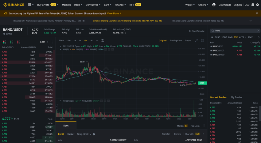 Piyasanın nasıl göründüğünü anlamak için üst menüdeki Market’e gitmek gerekir. Ardından BAND token’ı search ederek Trading’e tıklanması gerekmektedir.