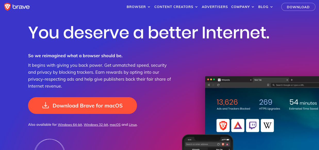 Mozilla kurucu ortağı Brendan Eich tarafından kurulan Brave, kullanıcının “kontrolü geri almasını” sağlayan bir tarayıcıdır. Zararlı reklamları ve izleyicileri engeller. Bunun yerine blockchain tabanlı mikro ödemelerle yayıncının gelirini arttırmaktadır. Zararlı reklamları ve kullanıcıları engellemek demek, kullanıcıların sayfalarının daha hızlı yüklenmesi demektir. Hatta bu konuda, rakiplerinden 6 kat daha hızlı olduğu da bilinir. Böylece, daha özgür bir şekilde internette takılabilir ve bilgilerinizin satılmadığından emin olabilirsiniz.