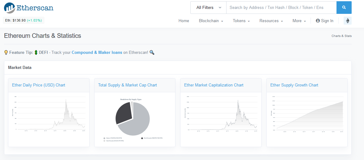 En popüler Ethereum işlem takiplerinden biri Etherscan’dır. Etherscan, blockchain.com’daki çeşitliliğe benzer bir şekilde kullanıcılarının oldukça geniş bilgilere ve grafiklere ulaşmalarına izin verir. Etherscan’ın sahip olduğu ekstra bir özellik de işlemler için tüm network’ten eleme yapmak yerine sadece ERC-20 ve ERC-721 gibi token’lar için özel aramalar yapabilmenizdir.