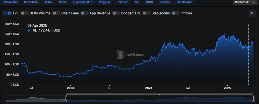 Referans olarak, Rootstock’un toplam kilitli değeri (TVL) 9 Nisan 2025 itibarıyla yaklaşık 172 milyon Dolar seviyesindeydi. Bu rakam, Rootstock ağı genelindeki aktiviteyi yansıtıyor — sadece BTCFi değil — ancak Bitcoin yerel ekosistemlerinin toplam likidite açısından hala Ethereum’un gerisinde kaldığını gösteriyor. TVL’deki düşüş, Bitcoin DeFi’deki zayıflığı değil, daha geniş piyasa koşullarını yansıtıyor.