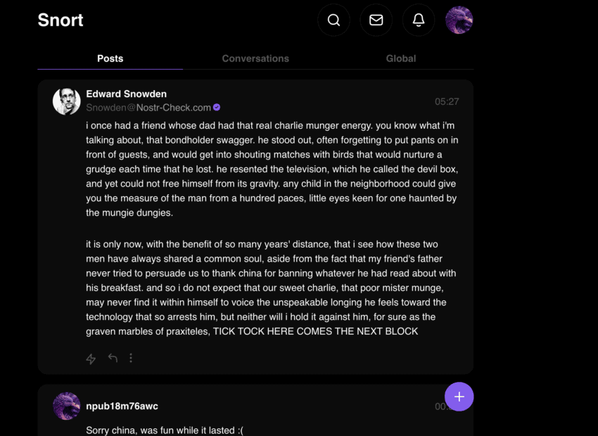 Artık Damus tarafından oluşturulan anahtarlarımızı kullanarak Snort’a giriş yapmış bulunuyoruz. Şimdi ise Damus’ta takip ettiğimiz Edward Snowden’in gönderilerine bir göz atalım. Bir dakika, biz Snort’ta Edward’ı takip etmiyoruz ama yine de görebiliyoruz! Anlaşılacağı üzere Nostr’a özgü özel anahtarlar, Nostr istemcileri arasında tutarlı ve tüm ekosistemle yüksek derecede uyumludur.