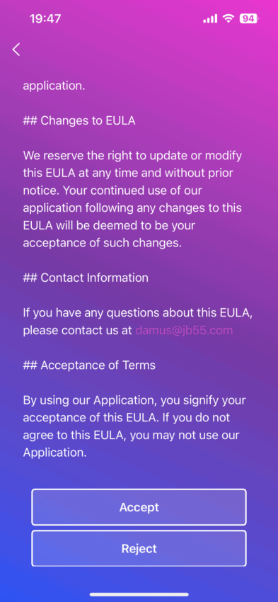 2. Adım: ChatGPT’nin geliştirilmesine yardımcı olduğu Son Kullanıcı Lisans Sözleşmesine bir göz atın. Tercihlerinize göre “Reddet” veya “Kabul Et” seçeneğini tıklayabilirsiniz. EULA (Son Kullanıcı Lisans Sözleşmesi) sansürlenebilir olsa da, Damus sansür edilmeyeceğini vaat ediyor.