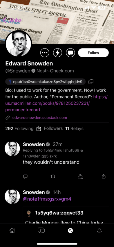 Eğer bir kullanıcı arıyorsanız doğrudan “public key” sorgulayarak search edebilir ve bulabilirsiniz. Örneğin Edward Snowden’ın açık anahtarını kullanarak onu takip edebilirsiniz. Public key üzerinden profil bölümüne de ulaşabilirsiniz. Evreka! Edward Snowden Damus’ta ve biz de onu takip ediyoruz.