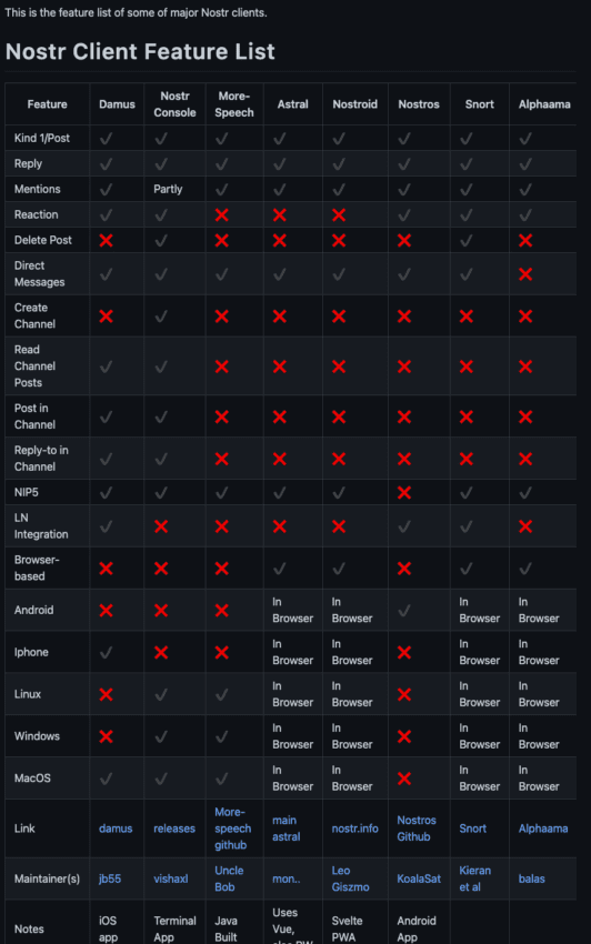 Yukarıda da bahsedildiği gibi, Nostr bir açık protokoldür ve merkezsizleşme vizyonunu ilerletmek için birden fazla istemci kullanır. İşte diğer popüler istemcilerin listesi ve sundukları özellikler: