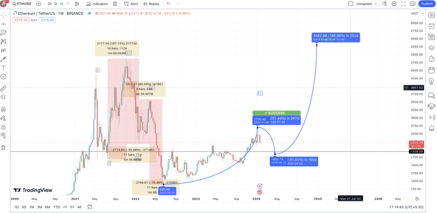 Bu fiyattan, 2025’in sonlarına doğru ortaya çıkması beklenen %187,13’lük bir artış daha bekleyebiliriz. Bu, 2025 için ETH fiyat tahminini 6767 dolar ve hatta daha muhafazakar bir önlem arıyorsanız 5000 dolar olarak gösteriyor. Bu analiz, 2024’ün en yüksek seviyesi olan 4000 doları akılda tutuyor ve bunun üzerine inşa ediliyor.