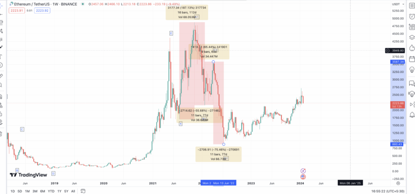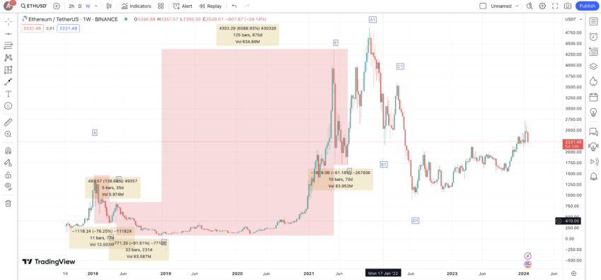 Bu E1 seviyesinin ve bir sonraki düşük veya X1’in 1850 Dolar’da ortaya çıktığını varsayarsak, 2024’te minimum ETH fiyatının 1800 $’ ın altına düşmemesini bekliyorduk.
