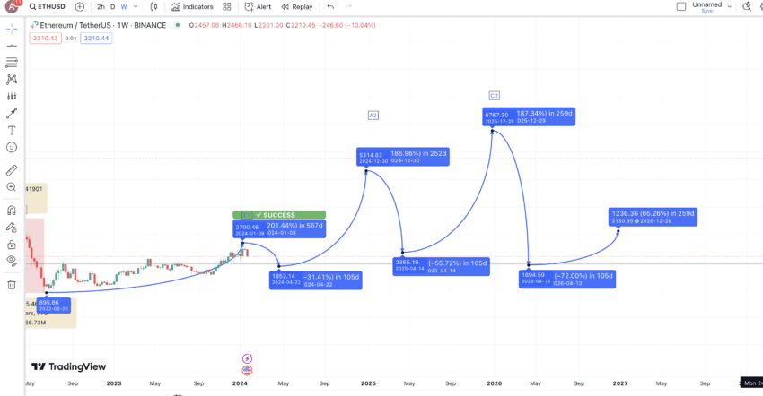 2025 için ETH fiyat tahminimiz tutarsa ve madeni para fiyatı 2025’in sonunda 6767 dolara ulaşırsa, hızlı satış sayesinde 2026’da daha derin bir düzeltme bekleyebiliriz. Bu noktada, ETH sahiplerinin %100’ü parada olmalı ve bu da 2026’yı daha katı bir düzeltme yılı haline getirmelidir. Bir önceki yüksek seviyeden veya C2’den, ortalama fiyat tanımlamamıza göre ETH’nin 105 gün içinde %72.036 düşmesini bekleyebiliriz.