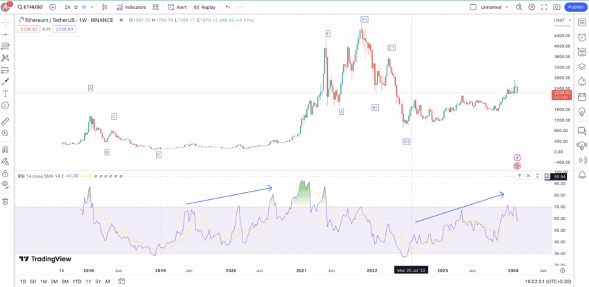 Bu fiyat hareketini tamamlayan RSI göstergesi, fiyat hareketini daha önce alay eden ve A’dan X’e modelle ilişkili daha yüksek yüksek oluşumları takip eden RSI göstergesidir.