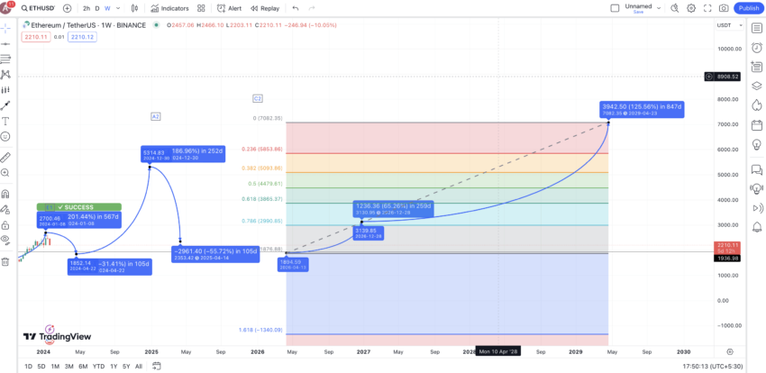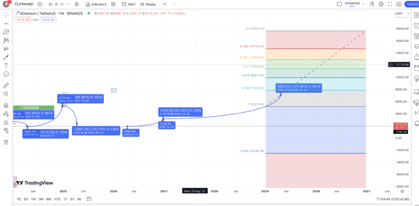 Bu boğa ve ayı döngülerini aklımızda tutarsak, ETH’nin 2029’un sonunda tüm zamanların en yüksek seviyesi olan 7082 dolara ulaşması gerekiyor. Bu seviyeye ulaşılırsa, 2029’un en düşük seviyesinin 5100 dolar civarında oluşması beklenirken, Ethereum fiyatının 2030 yılına kadar 17658 dolara kadar yükselmesini bekleyebiliriz.