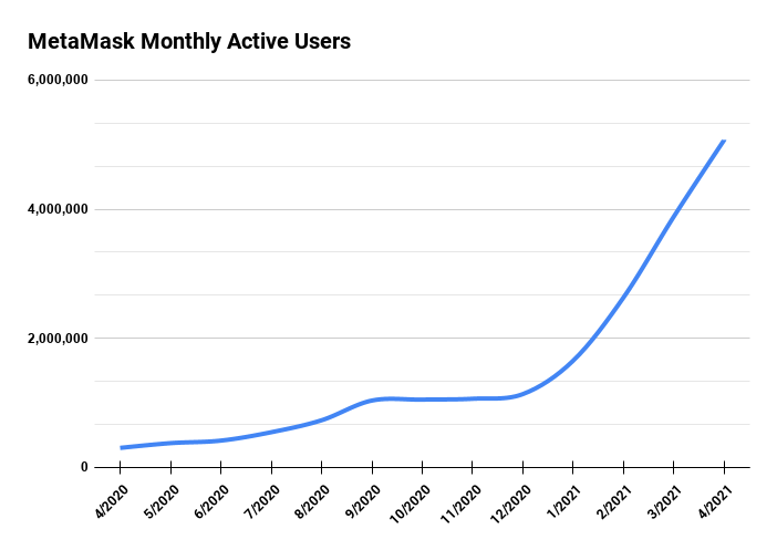 Bu yüzden herhangi bir dApp’i ziyaret ettiğinizde MetaMask cüzdanınızı ona bağlayabilir ve uygun gördüğünüz şekilde fon aktarımında bulunabilirsiniz. Web tarayıcınızla yapabildiğiniz entegrasyon sayesinde MetaMask oldukça kullanışlı ve popüler hale gelmiştir. Aşağıda MetaMask’ın benimsenme oranının grafiği verilmiştir. Grafikte gördüğünüz sürekli artan benimsenme oranının bu entegrasyonlarla doğru orantılı olduğu gözlemlenebilir.