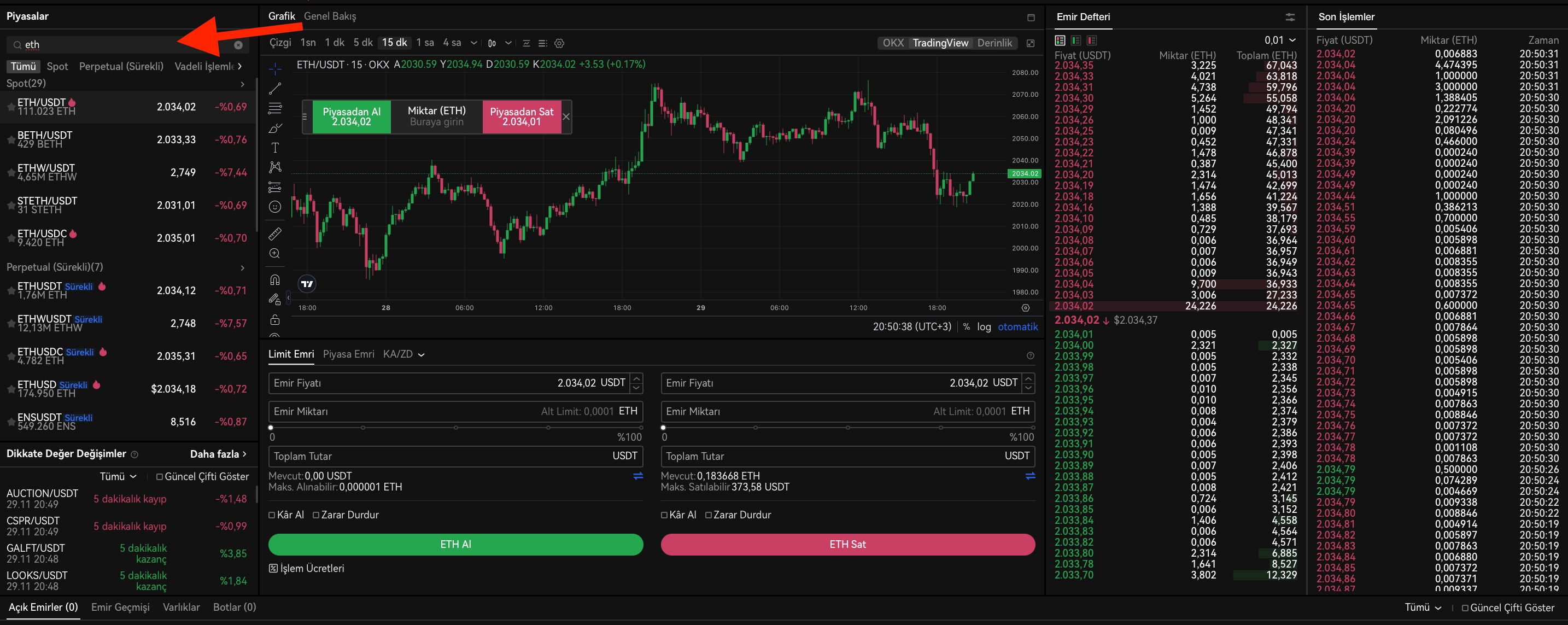4. Trading çiftlerinde ETH’yi arayın ve dilediğiniz trading çiftini seçin.