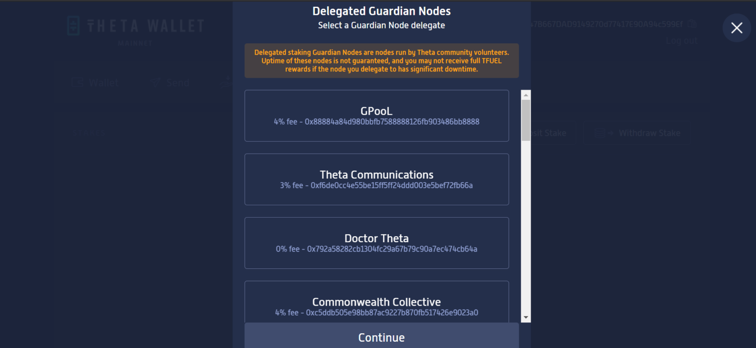 Hangi node’u seçtiğiniz önemlidir. Çünkü node ana bilgisayarına ne kadar ücret ödeyeceğiniz bu süreçte belirlenebilir. Çok fazla Theta token’ınız yoksa tek bir seçeneğiniz olur. Bununla birlikte Theta staking için ödülünüzün geldiği token türü olan TFuel token’ları için bunları 10.000 TFuel token’larından stake edebilirsiniz.