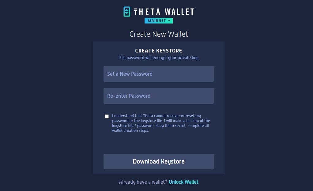 Theta staking için thetatoken.org adresini ziyaret ederek kayıt olabileceğiniz bir Theta cüzdanına ihtiyacınız olacaktır. Bunu, sayfanın üst kısmındaki ‘Wallet’ ve sonraki sayfadaki ‘Create Wallet’ seçeneklerine tıklayarak yapabilirsiniz. Bu daha sonra sizi bir hesap kayıt sürecinden geçirecek ve sizden bir şifre oluşturmanızı isteyecektir.
