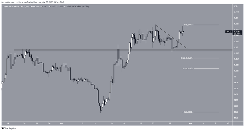 TOTALCAP, 27 Mart’ta 1,09 trilyon doları destek olarak onayladıktan sonra yükselişe geçti. Ardından alçalan direnç çizgisini kırmayı başardı.