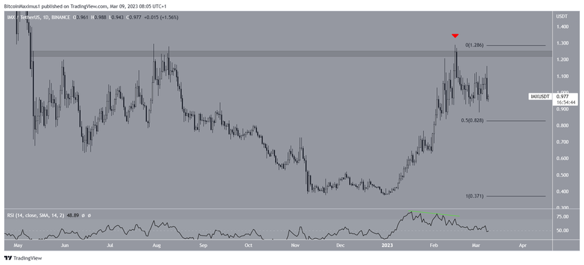 IMX fiyatı, 15 Şubat’ta 1,25 dolar direncinden ret yedikten sonra düşüşe başladı (kırmızı simge). Bu ret ile beraber bir süredir devam eden yükseliş son buldu. Düşüşten önce günlük RSI’da da negatif uyumsuzluk ortaya çıktı.