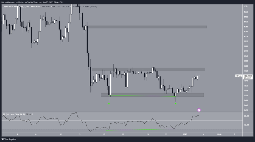 Kripto para piyasası toplam değeri, 18 Aralık ve 30 Aralık arasında, 752 milyar dolar destek bölgesi içinde çift dip oluşturdu. Çift dip, yükseliş formasyonu olarak kabul edilir. Yani çoğu zaman fiyatta artışa sebep olur. Ayrıca, 6 saatlik RSI’da da pozitif uyumsuzluk ortaya çıktı.