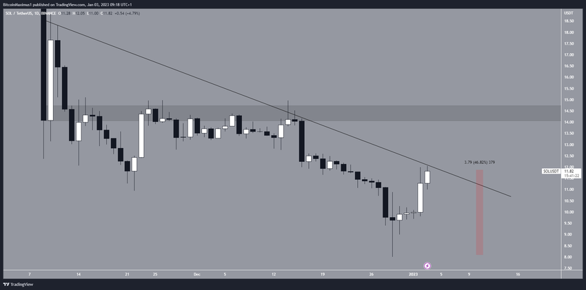SOL fiyatı, 9 Kasım’dan bu yana alçalan direnç çizgisi altında değer kaybediyor. Bu aşağı yönlü hareket sonucunda 29 Aralık’ta 8 dolara düşüş gerçekleşti. Kısa bir süre sonra Solana, aşağı sarkan uzun fitil oluşturdu (yeşil simge) ve yükselişe geçti. Yüzde 47’lik artıştan sonra ise alçalan direnç çizgisine ulaştı.