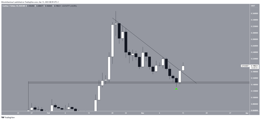 Conflux fiyatı, 21 Şubat’tan bu yana alçalan direnç çizgisi altında düşüş gösteriyordu. 11 Mart’ta bu kripto para birimi, 0,132 dolara kadar geriledi. Ancak bu noktada sıçradı ve 0,147 doları destek olarak onayladı.