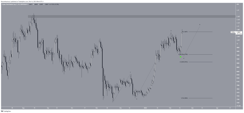 Kripto para piyasası toplam değeri (TOTALCAP), 13 Şubat’ta 0.382 Fib desteğinden sıçradı. İki gün sonra yükseliş hız kazandı ve bugün TOTALCAP, 1,08 trilyon dolara kadar ulaştı.