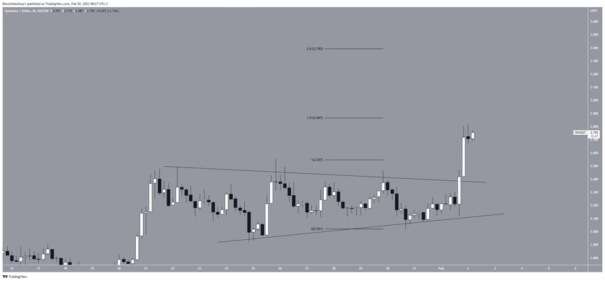 OP fiyatı, 1 Şubat’ta simetrik üçgenden çıkış yaptı ve 2,81 dolara kadar ulaştı. Bu, bir önceki düşüşün 1.61 harici Fib düzeltme seviyesine çok yakın oldu.