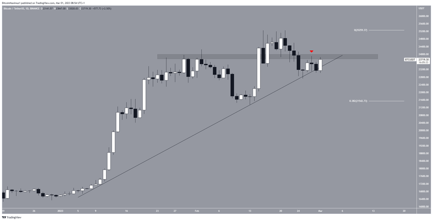 Bitcoin fiyatı, yıl başından bu yana yükselen destek çizgisi ile beraber artış gösteriyor. 16 Şubat’ta 25.250 dolara kadar ulaşsa da dört gün sonra 24.000 dolar desteğinin altına düştü. 27 Şubat’ta ise burayı direnç olarak test edip onayladı (kırmızı simge).