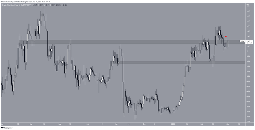 Kripto para piyasası toplam değeri (TOTALCAP), yutan boğa mumu oluşturma sürecinde yer alıyor. Eğer başarılı olursa, 1,04 trilyon dolar direncini de ele geçirecektir. Bu bölge, Eylül 2022’den bu yana direnç görevi gören kritik bir bölgedir.