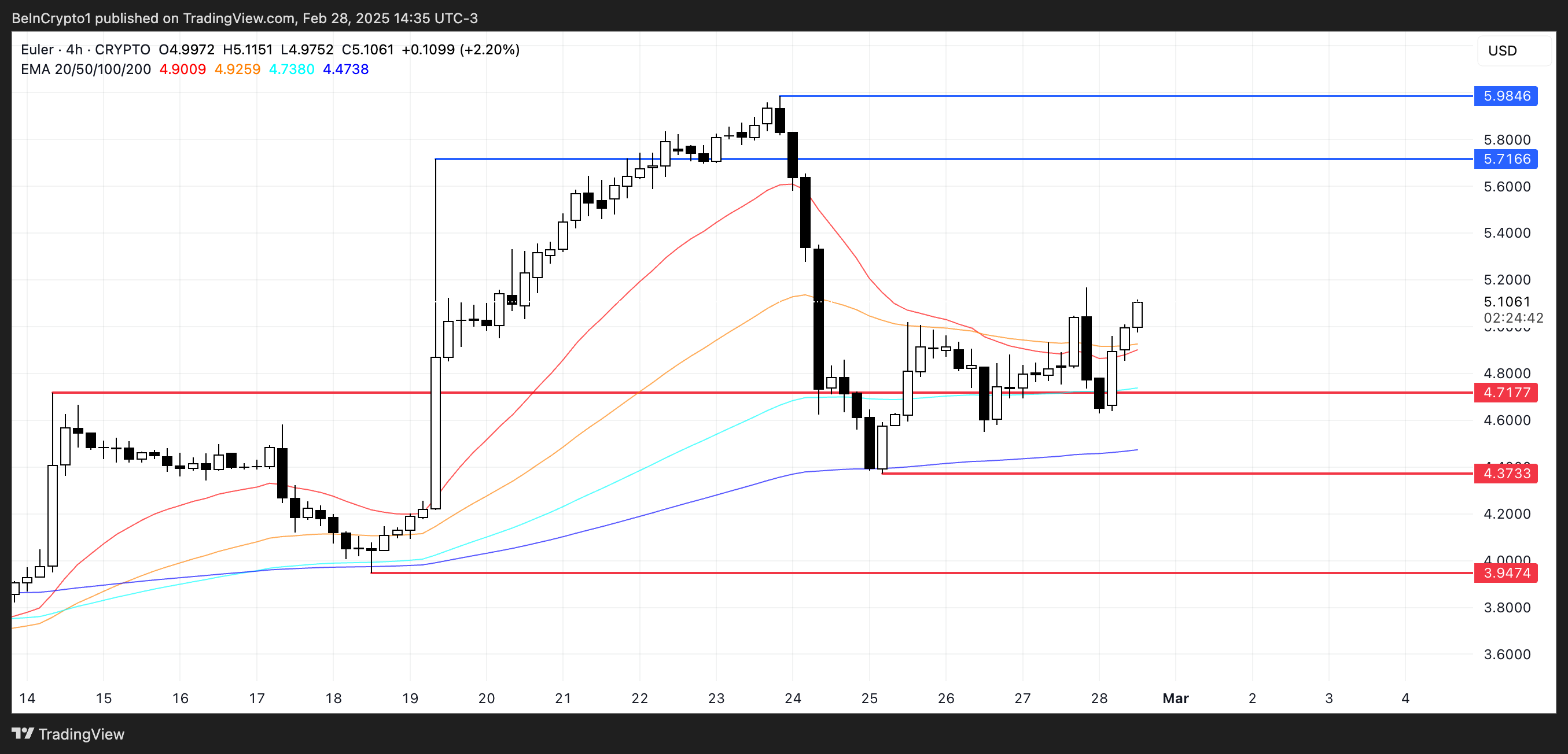 Tersine, başka bir düzeltme olursa, EUL 4,71 Dolar veya 4,37 Dolar’daki destekleri test edebilir ve bu seviyeler başarısız olursa, 3,94 Dolar’a kadar düşebilir. Bu destek ve direnç seviyeleri, EUL’un bir sonraki yönsel hareketini belirlemede anahtar olacak.
