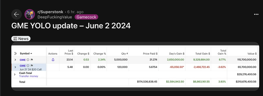 Reddit’in “DeepFuckingValue” hesabında Gill, GME hisselerinde ve alım opsiyonlarında 180 milyon doların üzerinde bir nominal değere sahip olduğunu açıkladı. Bu, Nisan 2021’den bu yana ilk Reddit gönderisi oldu.