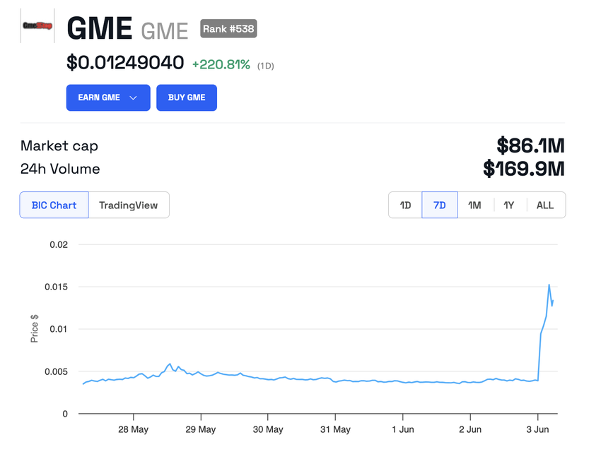 Gill’in stratejik açıklaması , meme coin sektöründe de önemli bir ralliyi tetikledi. Özellikle, Solana tabanlı GME meme coin’i etkiledi. Bu dijital varlık, %220’lik bir değer artışına tanık oldu ve piyasa değerini 24 saat içinde 85 milyon doların üzerine çıkardı.
