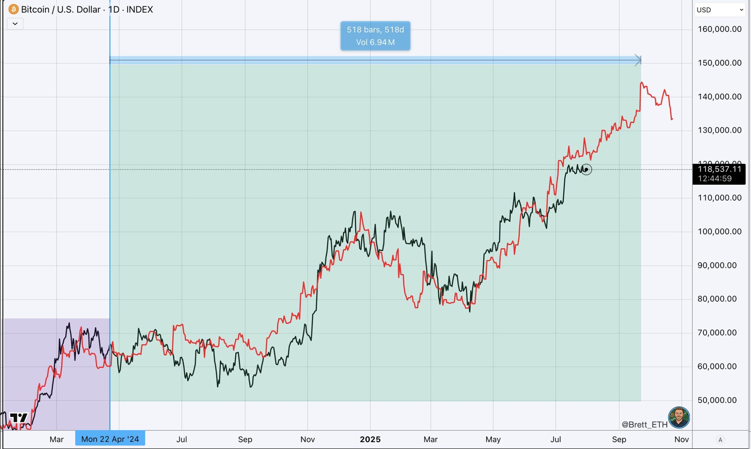 “Küresel M2, daha düşük bir zirve ve daha düşük bir dip oluşturdu. 84 günlük gecikmeyi kullanarak, mevcut zirvenin eylül ayı sonunda bekleniyor. Aşağıdaki aralık ayı gönderimde belirttiğim gibi, geçmiş üç Bitcoin zirvesi halving’den 525–532 gün sonra gerçekleşti. Küresel M2’nin mevcut zirvesi halving’den 518 gün sonra. Tesadüf mü?” ₿rett dedi.