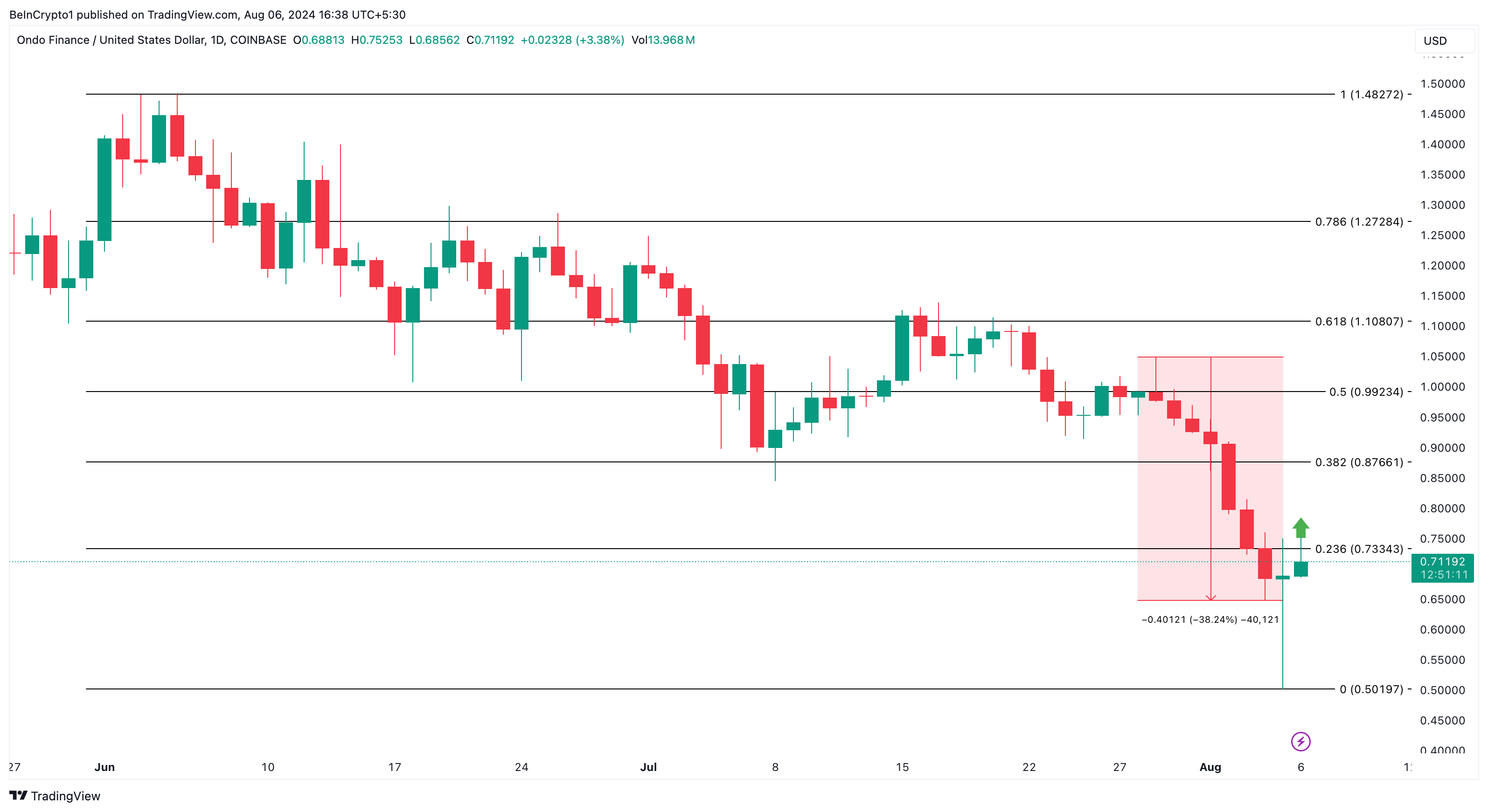 ONDO’nun son fiyat artışı, tüm zamanların en yüksek seviyesi olan 1,48 dolara ulaşmaktan şu anda %51,48 uzakta olduğu anlamına geliyor. Bu toparlanma aynı zamanda token için bir satın alma sinyali sunmuş gibi görünüyor.