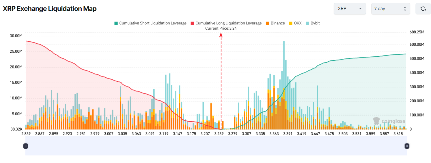 Özellikle, XRP %8 yükselip 3,50 Dolara ulaşırsa, yaklaşık 500 milyon Dolar değerinde short pozisyonlar likide edilecek. Tersine, XRP %8 düşüp 3,00 Dolara gerilerse, long pozisyonlar yaklaşık 370 milyon Dolar likidasyonla karşı karşıya kalacak.